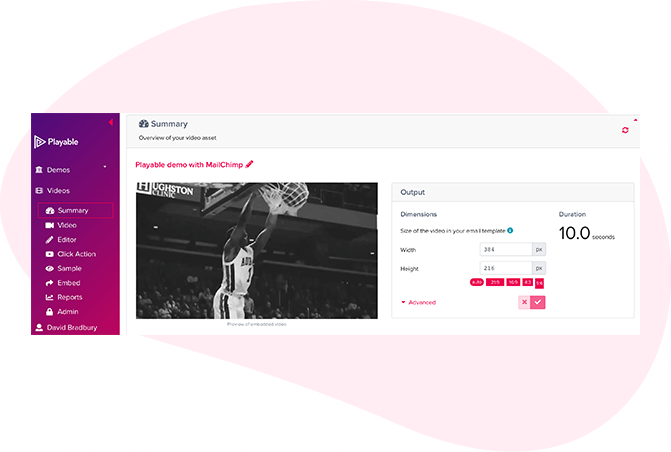Erstellen Sie einen Titel für Ihr Video, dieser wird verwendet, um es in Zukunft in Ihrem Playable-Konto und in der Berichterstattung zu finden. Unter Bezugnahme auf die Abmessungen des Bildes für die E-Mail-Vorlage können Sie nun die Größe (Breite) des zu erstellenden Videoinhalts eingeben oder die von Playable vorgeschlagene optimale Größe beibehalten.