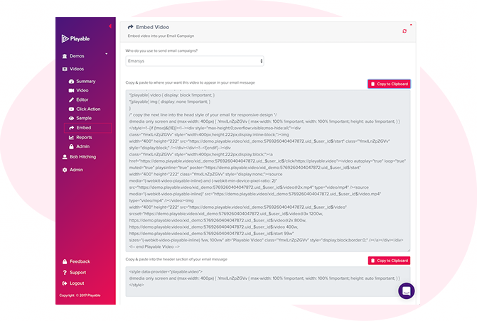 HTML von Playable einfügen Code einbetten, welche du in die Zwischenablage kopiert, direkt an die Position, an der Sie das Video anzeigen möchten.