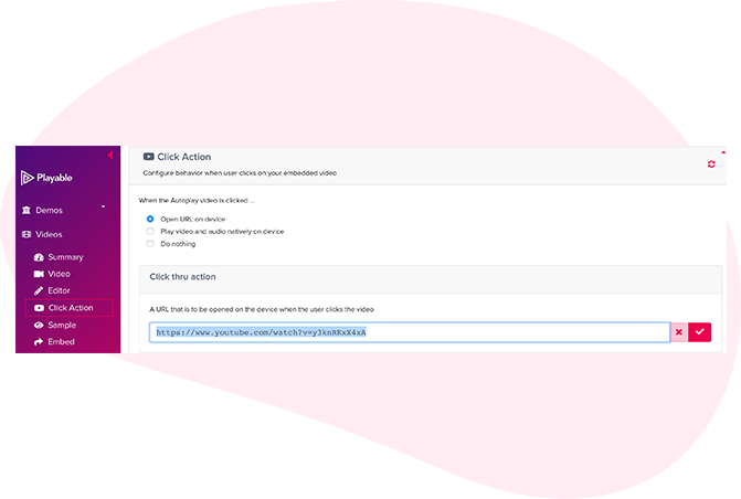 Um deine . einzustellen Klicken Sie auf Aktion, fügen Sie den Link/die URL der Zielseite hinzu, zu der alle Klicker des Videos weitergeleitet werden sollen, und speichern Sie sie.