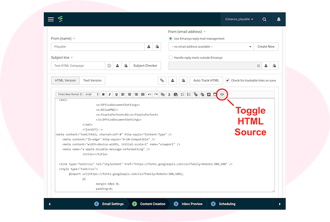 Zurück zum Emarsys HTML-E-Mail-Editor, und klicken Sie auf HTML-Quelle umschalten um den HTML-Code der E-Mail-Vorlage anzuzeigen.