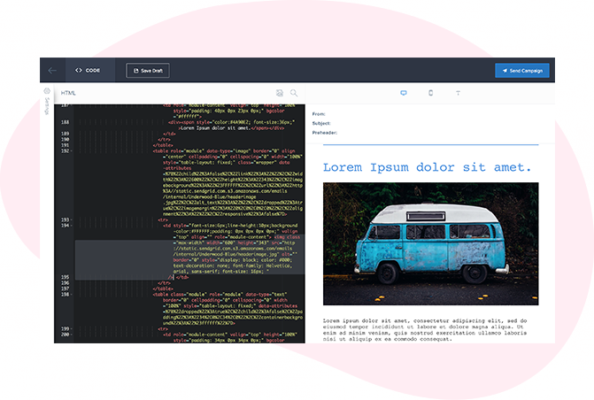 Die Code-Editor wurde entwickelt, um Ihnen das Erstellen und Bearbeiten von a SendGrid-Vorlage, oder erstellen Sie eine Vorlage mit Ihrem Benutzerdefinierter HTML-Code.