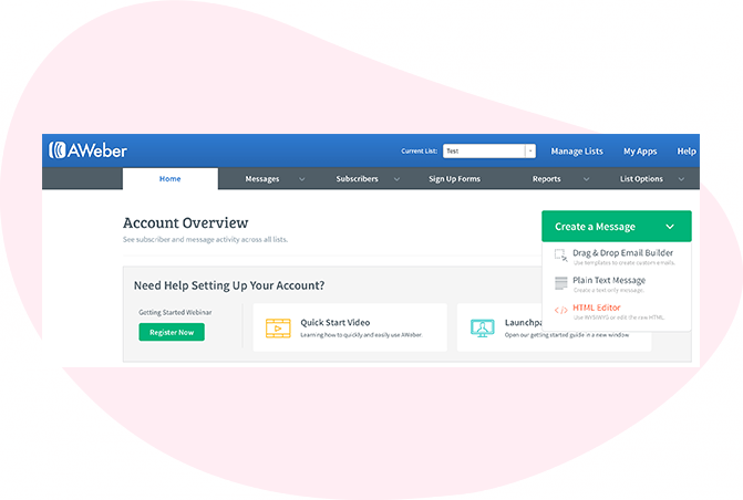 Select Create a Message in AWeber, selecting the HTML Editor option from the drop down.