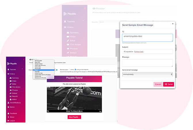 Preview how your video email plays in the major email clients by using the drop-down above the preview window.