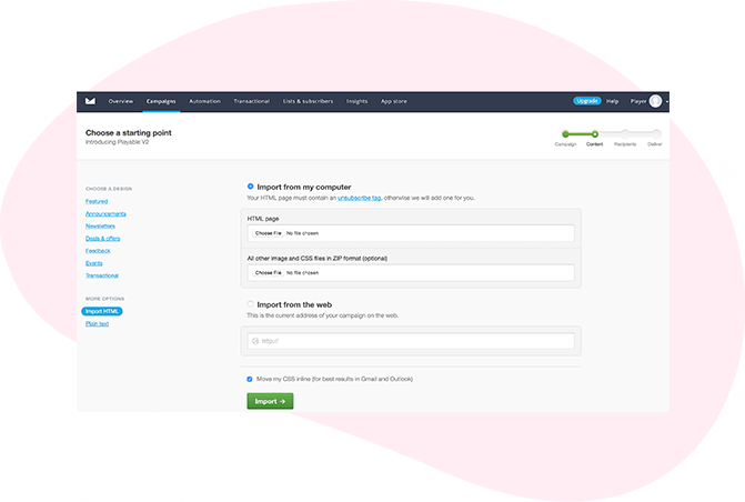 Import your HTML template, or alternatively, you can enter the URL of your template, to import it from the web.