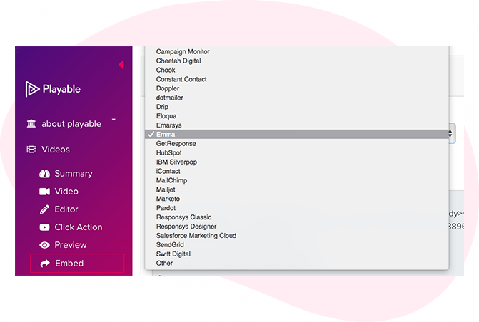 To embed the video into your email template select Emma from the drop-down list of email providers, on the Embed page.