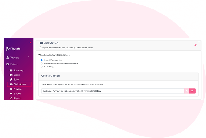 To set your Click Action, add the link/URL of the destination page you want any clickers of the video to be re-directed to, and save it.