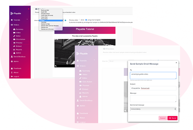 Preview how your video email plays in the major email clients by using the drop-down above the preview window.