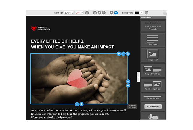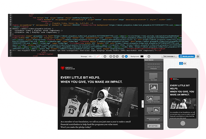 Your template now appears in the Template Editor. Add blocks, delete blocks and edit your content in the normal way. Please note that video email delivers better results when the video appears at the top of the email, or above the fold.