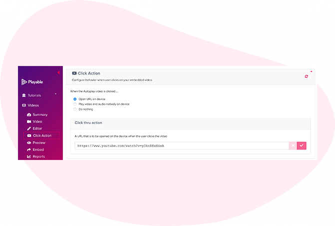 To set your Click Action, add the link/URL of the destination page you want any clickers of the video to be re-directed to, and save it.