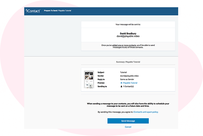 In this tutorial, you will learn how to create, embed, and send a Video Email using iContact and Playable, which plays automatically at the moment of opening the email – like these examples.