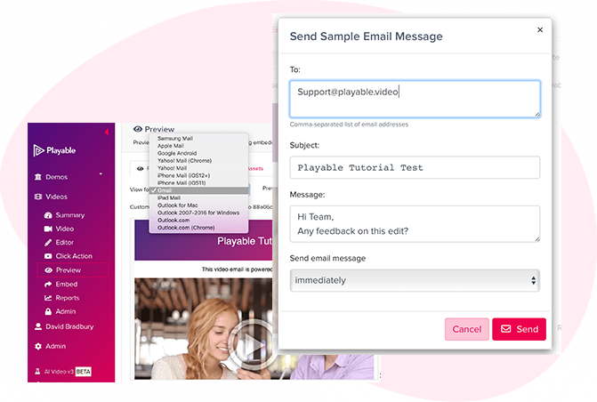 Preview how your video email plays in the major email clients by using the drop-down above the preview window.