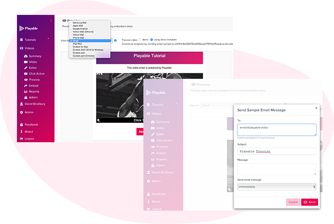 Preview how your video email plays in the major email clients by using the drop-down above the preview window.