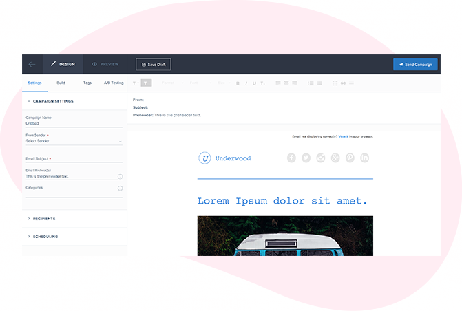 Add campaign Name, select the From Sender, enter Subject Line, and Pre-header. You may also select a category in which your campaign will reside for reporting and archive purposes.