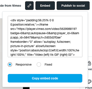 The Embed Code for your Vimeo video will be copied to your clipboard.